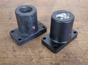 De uitvoering bestaat uit een stalen behuizing met een ingegoten witmetaal binnenwerk. Na het gieten is het onderdeel volledig nabewerkt tot de vereiste maatvoering en passing.
