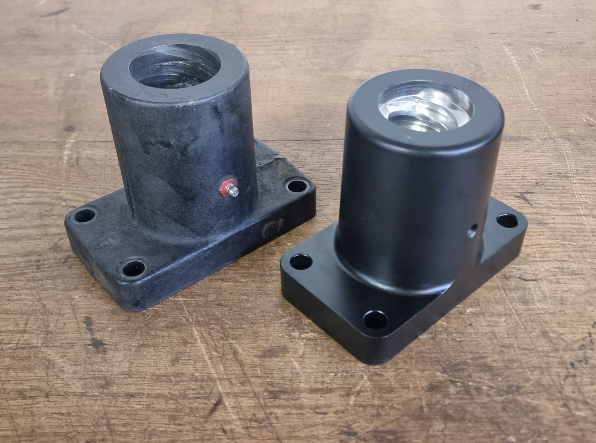 De uitvoering bestaat uit een stalen behuizing met een ingegoten witmetaal binnenwerk. Na het gieten is het onderdeel volledig nabewerkt tot de vereiste maatvoering en passing.